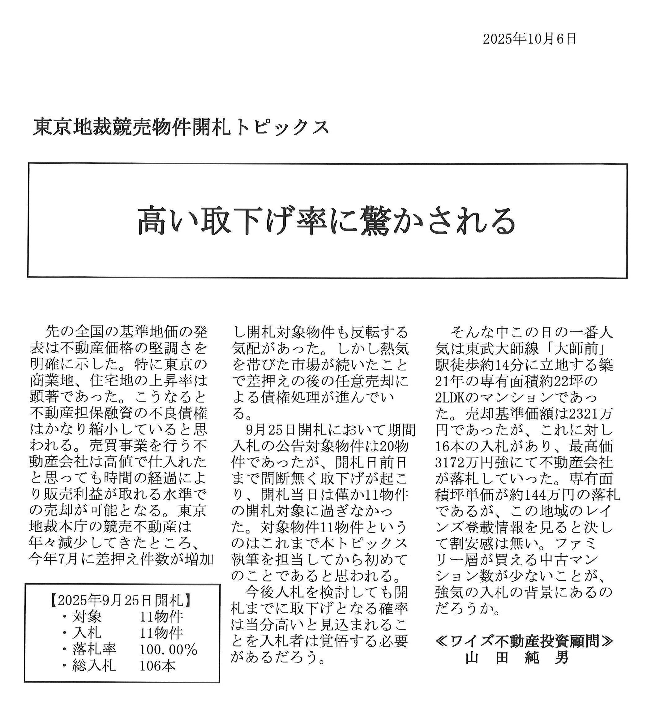 2025年10月6日「高い取下げ率に驚かされる」 競売・公売不動産/底地投資コンサルティング