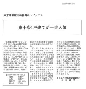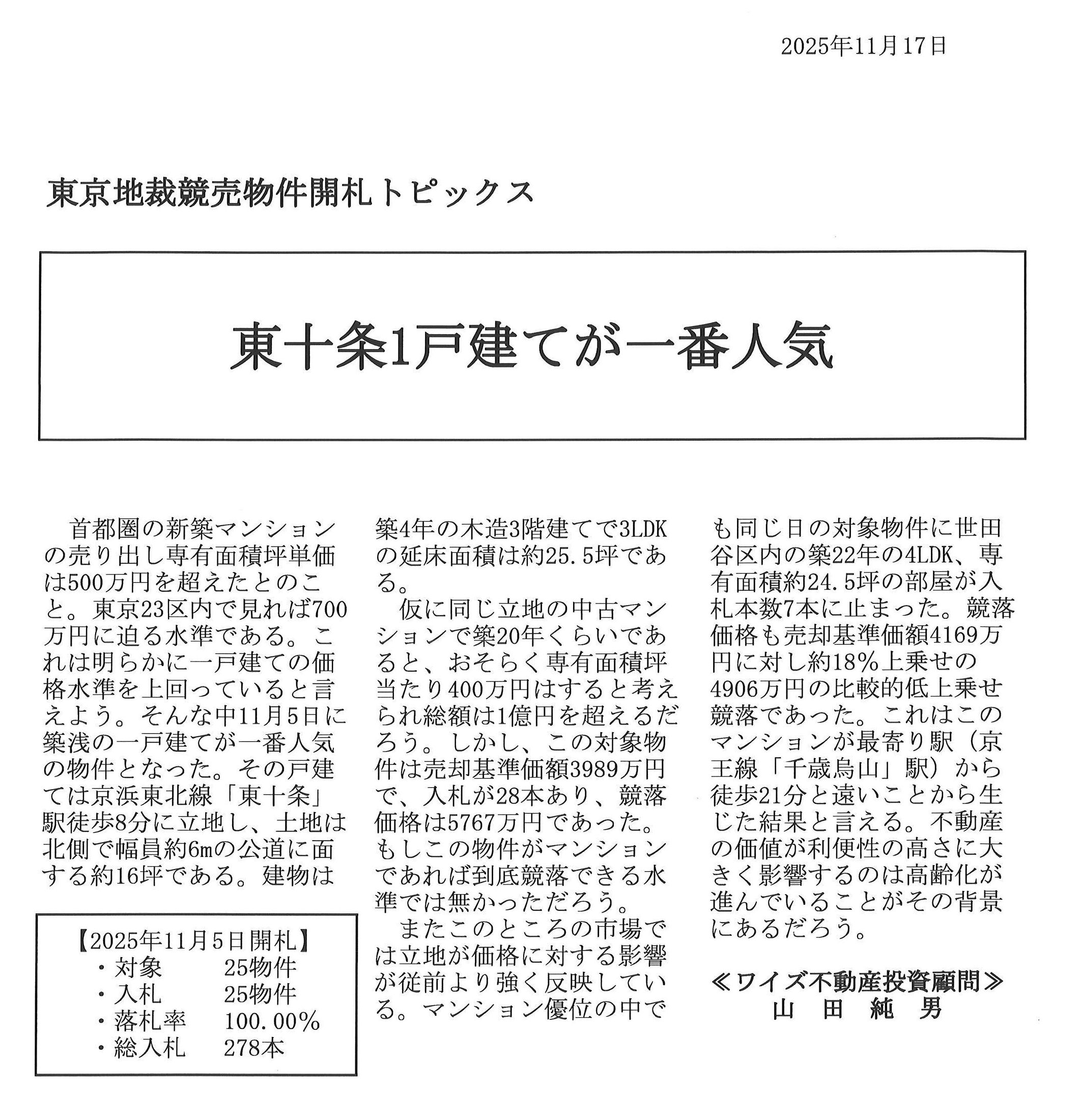 首都圏の新築マンションの売り出し専有面積坪単価は500万円を超えたとのこと。東京23区内で見れば700万円に迫る水準である。これは明らかに一戸建ての価格水準を上回っていると言えよう。そんな中11月5日に築浅の一戸建てが一番人気の物件となった。その戸建ては京浜東北線「東十条」駅徒歩8分に立地し、土地は北側で幅員約6mの公道に面する約16坪である。建物は築4年の木造3階建てで3LDKの延床面積は約25.5坪である。