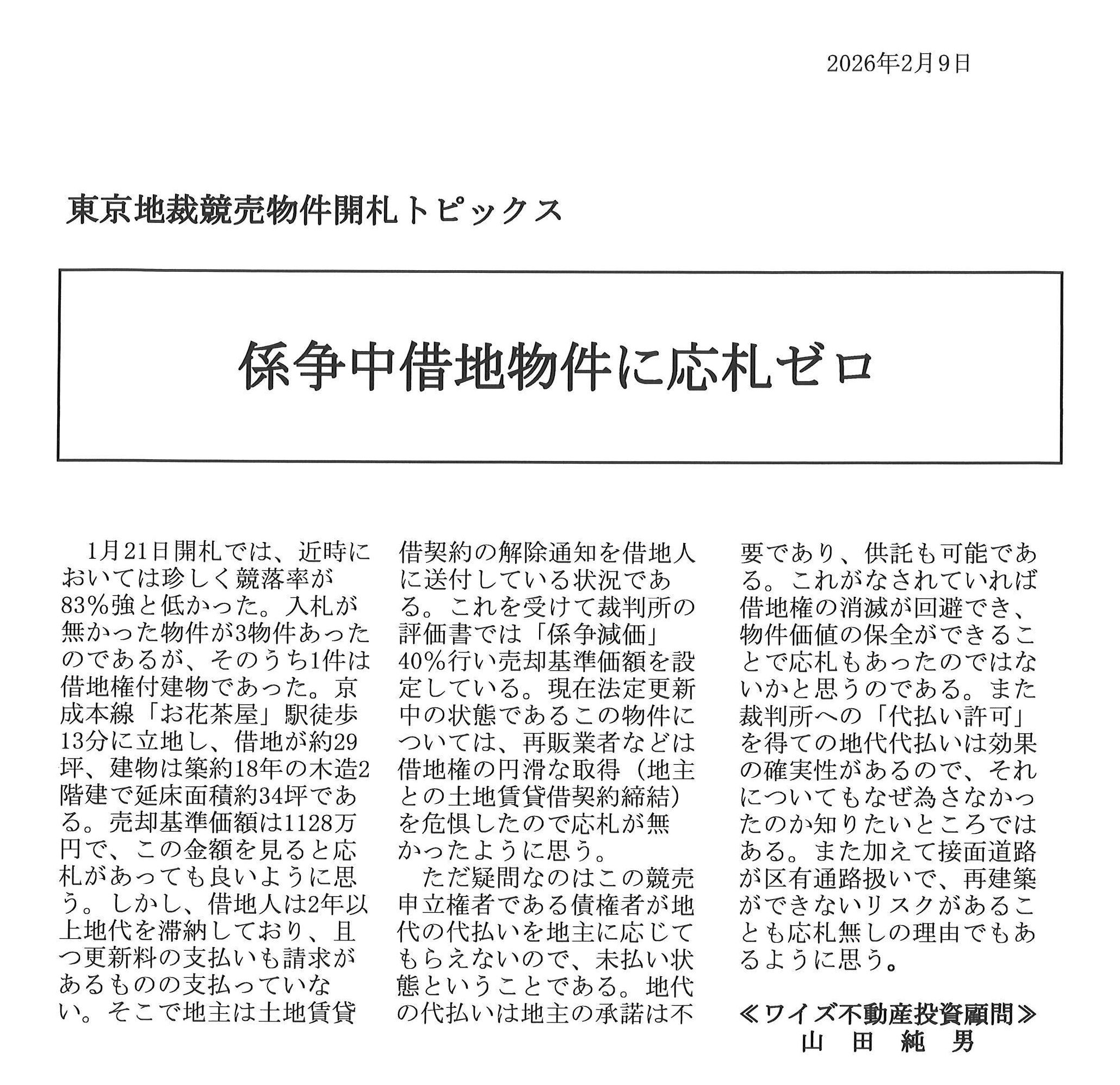 2026年2月9日「係争中借地物件に応札ゼロ」