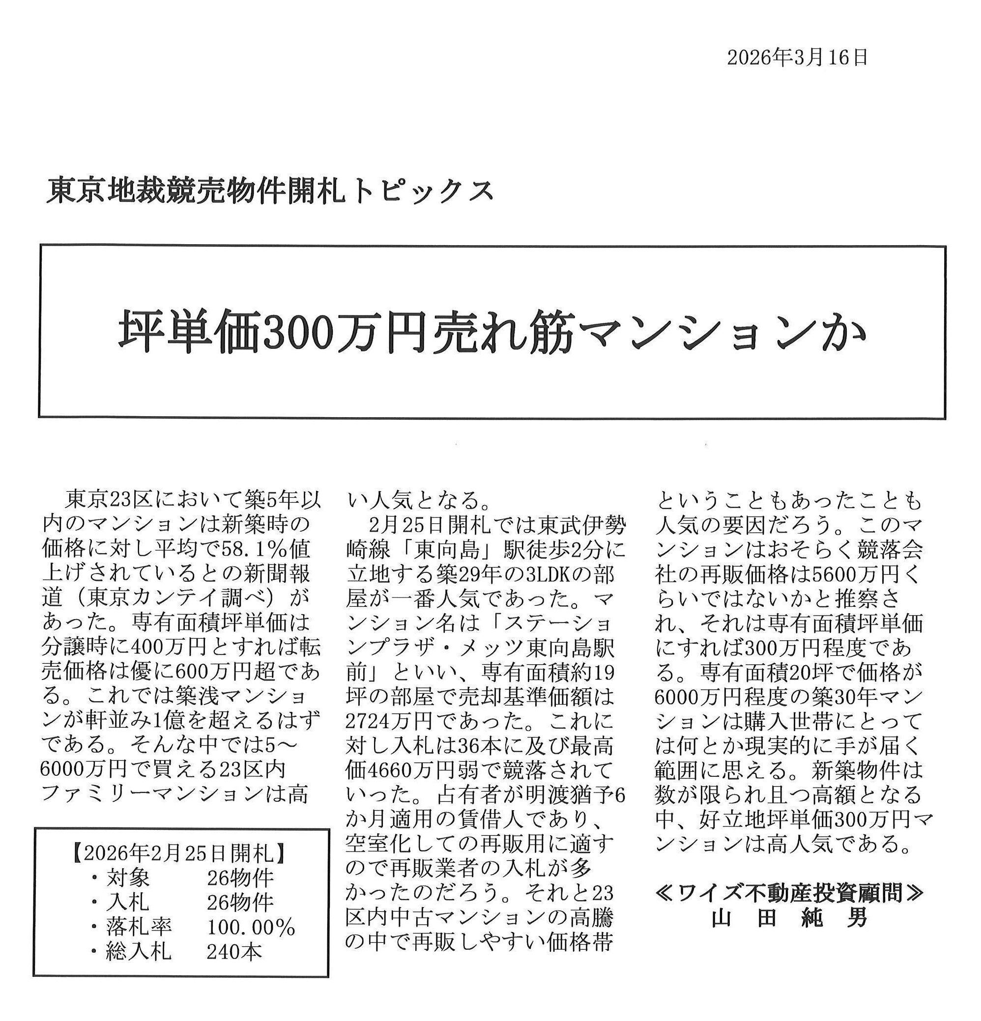 東京23区において築5年以内のマンションは新築時の価格に対し平均で58.1%値上げされているとの新聞報道(東京カンテイ調べ)があった。専有面積坪単価は分譲時に400万円とすれば転売価格は優に600万円超である。これでは築浅マンションが軒並み1億を超えるはずである。そんな中では5~6000万円で買える23区内ファミリーマンションは高い人気となる。2月25日開札では東武伊勢崎線「東向島」駅徒歩2分に立地する築29年の3LDKの部屋が一番人気であった。マンション名は「ステーションプラザ・メッツ東向島駅前」といい、専有面積約19坪の部屋で売却基準価額は2724万円であった。これに対し入札は36本に及び最高価4660万円弱で競落されていった。占有者が明渡猶予6か月適用の賃借人であり、空室化しての再販用に適すので再販業者の入札が多かったのだろう。それと23区内中古マンションの高騰の中で再販しやすい価格帯ということもあったことも人気の要因だろう。このマンションはおそらく競落会社の再販価格は5600万円くらいではないかと推察され、それは専有面積坪単価にすれば300万円程度である。専有面積20坪で価格が6000万円程度の築30年マンションは購入世帯にとっては何とか現実的に手が届く範囲に思える。新築物件は数が限られ且つ高額となる中、好立地坪単価300万円マンションは高人気である。