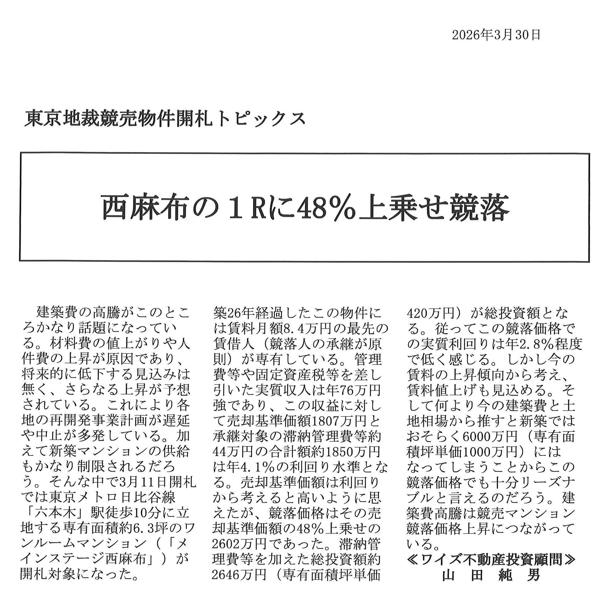 2026年3月30日「西麻布の1Rに48%上乗せ競落」