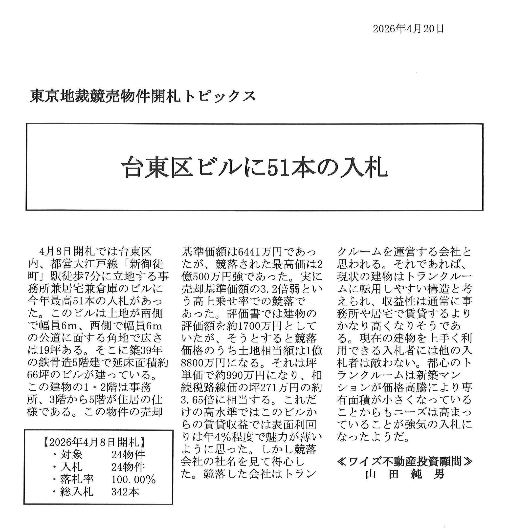 4月8日開札では台東区内、都営大江戸線「新御徒町」駅徒歩7分に立地する事務所兼居宅兼倉庫のビルに今年最高51本の入札があった。このビルは土地が南側で幅員6m、西側で幅員6ⅿの公道に面する角地で広さは19坪ある。そこに築39年の鉄骨造5階建で延床面積約66坪のビルが建っている。この建物の1,2階は事務所、3階から5階が住居の仕様である。この物件の売却基準価額は6441万円であったが、競落された最高価は2億500万円強であった。実に売却基準価額の3.2倍弱という高上乗せ率での競落であった。評価書では建物の評価額を約1700万円としていたが、そうとすると競落価格のうち土地相当額は1億8800万円になる。それは坪単価で約990万円になり、相続税路線価の坪271万円の約3.65倍に相当する。これだけの高水準ではこのビルからの賃貸収益では表面利回りは年4%程度で魅力が薄いように思った。しかし競落会社の社名を見て得心した。競落した会社はトランクルームを運営する会社と思われる。それであれば、現状の建物はトランクルームに転用しやすい構造と考えられ、収益性は通常に事務所や居宅で賃貸するよりかなり高くなりそうである。現在の建物を上手く利用できる入札者には他の入札者は敵わない。都心のトランクルームは新築マンションが価格高騰により専有面積が小さくなっていることからもニーズは高まっていることが強気の入札になったようだ。